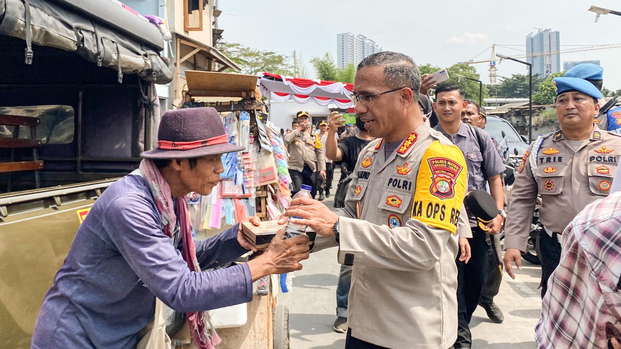 Kapolres Metro Jakarta Timur Kombes Pol Nicolas Ary Lilipaly didampingi Wakapolres serta para Pejabat Utama Polres Jakarta Timur dibantu unsur 3 Pilar Kecamatan Pulogadung membagikan 300 nasi box dan air mineral kepada warga masyarakat kurang mampu.