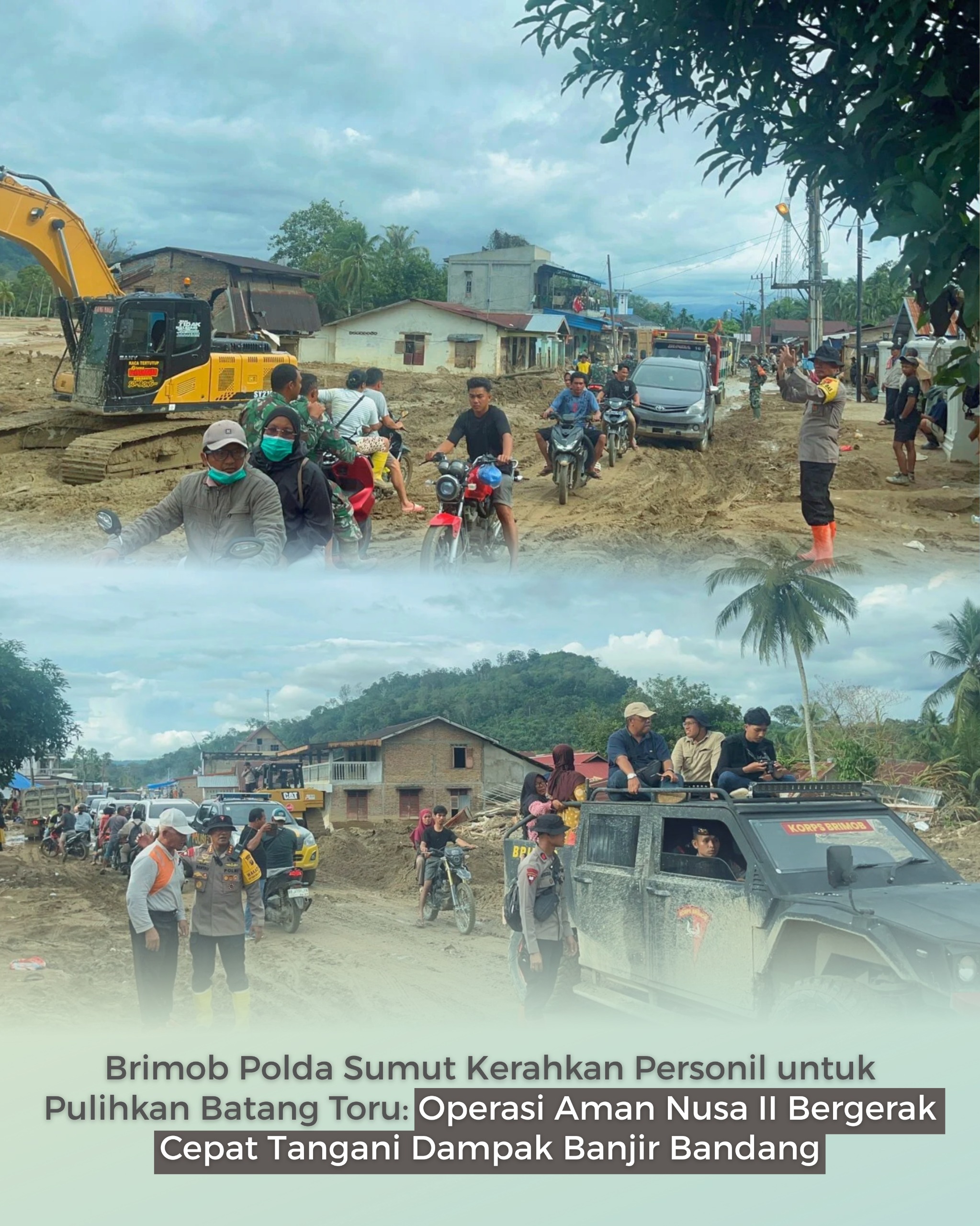 Tapanuli Selatan – Dalam misi besar penanggulangan bencana alam di wilayah Sumatera Utara, Satuan Brimob Polda Sumut kembali menunjukkan ketegasan dan kepedulian mereka dalam memberikan pelayanan terbaik kepada masyarakat. Pada Senin, 8 Desember 2025, personel Brimob yang tergabung dalam Operasi Aman Nusa II diterjunkan untuk melakukan pembersihan besar-besaran di wilayah Jl. Lintas Huta Godang, Kecamatan Batang Toru, salah satu area yang terdampak paling berat oleh banjir bandang.