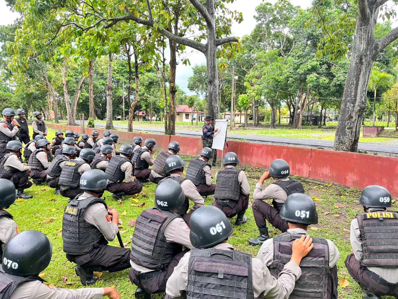 Personel Detasemen Gegana Satbrimob Polda Sulawesi Tengah melaksanakan tugas sebagai instruktur dalam materi Fungsi Teknis Brimob, khususnya Anti Anarkis, bagi para siswa Pendidikan Pembentukan Bintara di SPN Polda Sulteng.