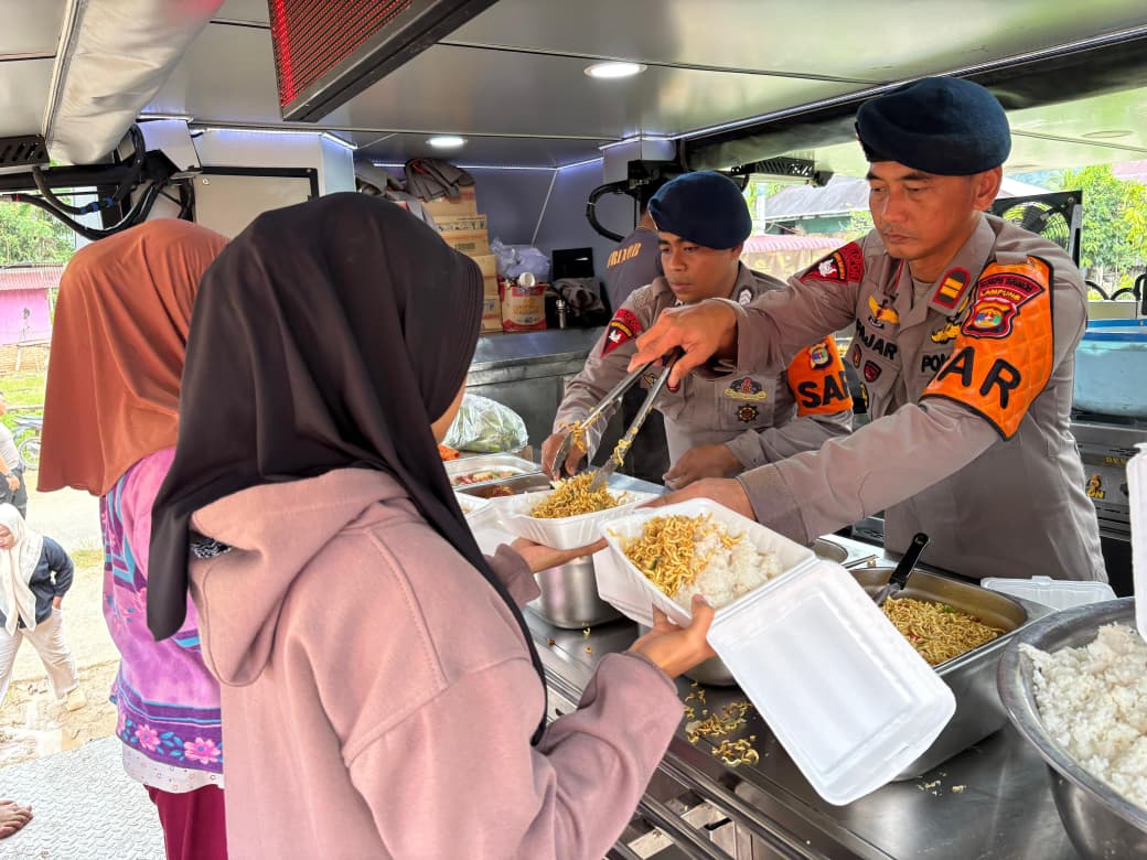 Sejak pagi hari, personel Brimob dengan penuh semangat dan kepedulian menyiapkan ratusan porsi makanan siap saji untuk dibagikan kepada masyarakat yang terdampak. Dapur umum ini menjadi tumpuan harapan warga, terutama bagi mereka yang aktivitas sehari-harinya terhenti akibat genangan air dan kerusakan fasilitas rumah tangga.