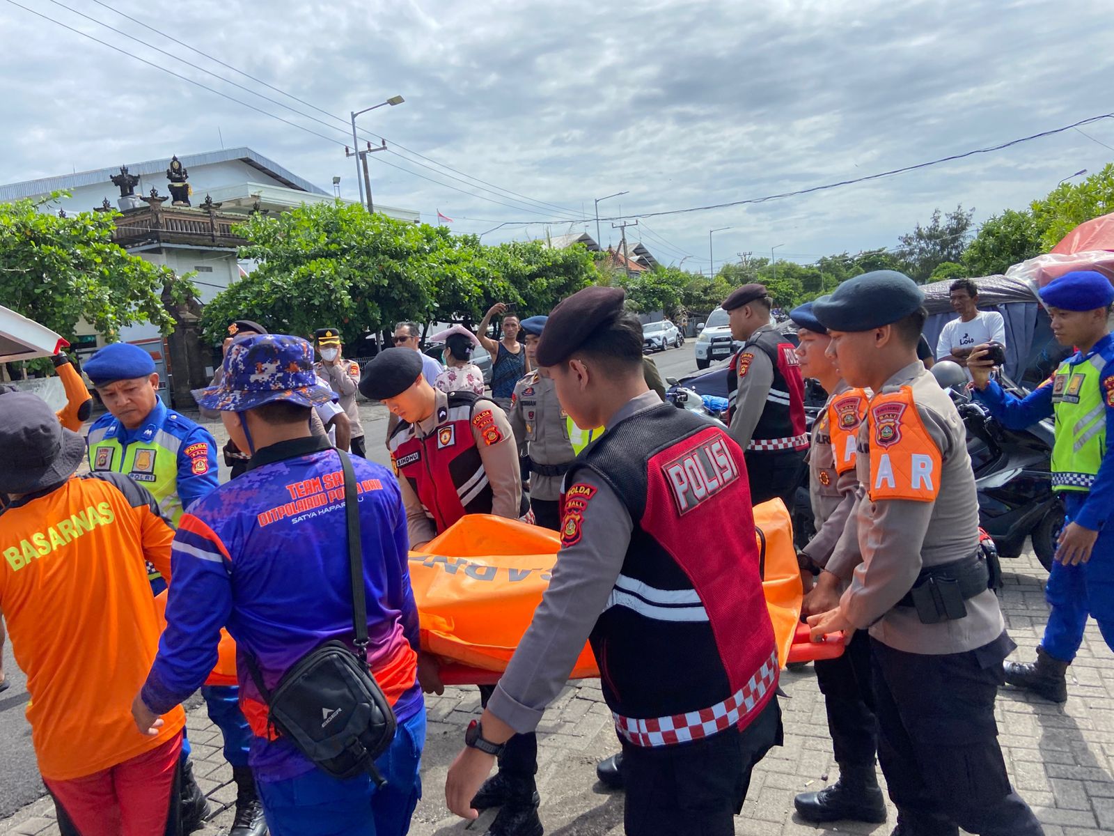 Personel Batalyon A Pelopor Satbrimobda Bali yang tergabung dalam KRYD SATGAS TINDAK SUBSATGAS SAR melaksanakan evakuasi korban tenggelam di Dermaga Barat Benoa, Selasa (16/12/2025).