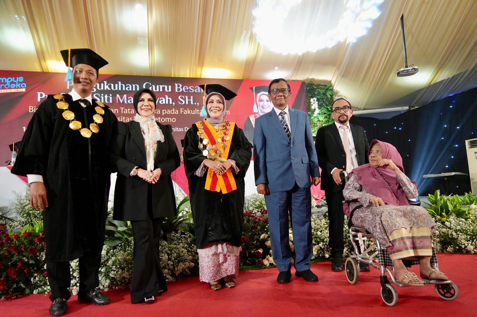 “Ini pernyataan saya, kalau di Indonesia ini penegakan hukum bisa dilakukan dengan baik, dengan benar, maka 50% dari seluruh persoalan bangsa ini selesai”kata Mahfud yang memberikan sambutan mewakili keluarga karena Prof Siti Marwiyah adalah adik kandungnya yang saat ini juga menjabat sebagai Rektor Unitomo Surabaya.