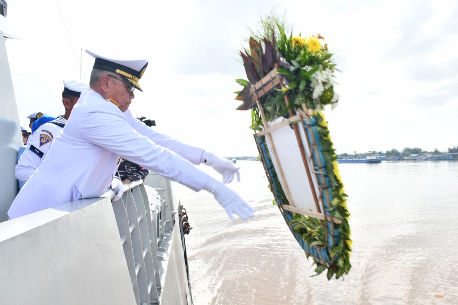 BRN | Pontianak – TNI AL, Lantamal XII,* Komandan Pangkalan Utama TNI Angkatan Laut (Danlantamal) XII Laksamana Pertama TNI Agoeng MKS memimpin jalannya upacara Tabur Bunga dalam rangka memperingati Hari Pahlawan tahun 2023 di atas Kapal Perang KRI Karotang-872 dengan mengarungi Sungai Kapuas dari titik Dermaga Satrol Lantamal XII, Pontianak Kalimantan Barat, Jumat (10/11/2023).