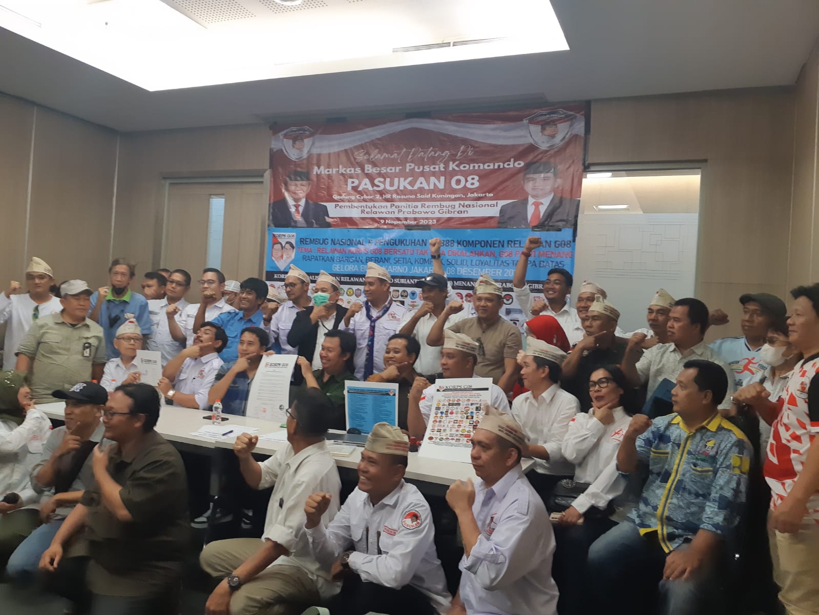 Dalam mewujudkan mimpi Demokrasi yang adil dan berlandaskan Bhineka Tunggal Ika, untuk Persatuan Indonesia, walaupun berbagai macam bentuk atribut-atribut relawan juga berbagai macam gaya support dari semua relawan, hari ini, 9 November 2023, telah dideklarasikan bertempat di Markas Komando Pusat PASUKAN 08, bersama sama oleh relawan yang berkumpul, yang terdiri dari 8.888 relawan yang hadir dan masuk ke dalam ruangan acara yang terbatas kemudian diwakili oleh 88 organ relawan yakni relawan MotorGP2024 (Masyarakat pengguna mobil & motor relawan Gibran Prabowo) diketuai M. Kuswandi, Perkumpulan Pedagang Kaki Lima & angkutan Barang (PPKP & AB) diketuai oleh Gus Huda Sulisti, Rumah Nusantara, prabowo Gibran (RNPB) diketuai oleh Miko Napitupulu, relawan So’Erick diketuai oleh Bapak Agus, kawal Gibran Bersama (KGB) diketuai oleh Roman Sibuea, Rumah Milenial Muda Indonesia diketuai oleh Netty Sitompul, Santri Merah Putih, Garuda Hitam, Pos Gibran, Pamppres 08, Getar 08, Ormas UMKM-Perukmi, Soulmate Prabowo 08, Forum Kawanua Jakarta, Prabu Satu, Jong Papua Indonesia (JOP 99), Brigade Gibran, Ketua DGN Waldy irawan, Paguyuban Perguruan Sebi Budaya Maung Pande, barisan nasional prabowo Gibran, dan masih banyak lagi organ organ yang hadir untuk mendedikasikan acara ini, kedatangan para relawan diterima langsung oleh Arfian selaku Ketua Umum PASUKAN 08 dan dijamu dalam keramahan persahabatan sesama perjuang antar relawan dengan damai serta diharapkan PASUKAN 08 dapat memberikan semangat baru kedalam pergerakan yang kemudian di satukan pada KORPS G08 yang memiliki arti Koalisi Relawan Prabowo Subianto Gibran 08.