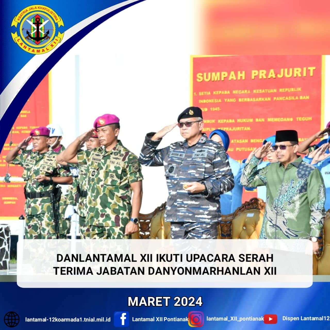 BRN, Mempawah, TNI AL,* Komandan Pangkalan Utama TNI Angkatan Laut (Danlantamal) XII Laksamana Pertama TNI Agoeng MKS mengikuti Upacara Serah Terima Jabatan (Sertijab) Komandan Batalyon Marinir Pertahanan Pangkalan (Danyonmarhanlan) XII di Lapangan Upacara Yonmarhanlan XII Jl. A. Rani Desa Kuala Secapah Kab. Mempawah Kalimantan Barat, Jumat (15/03/2024).