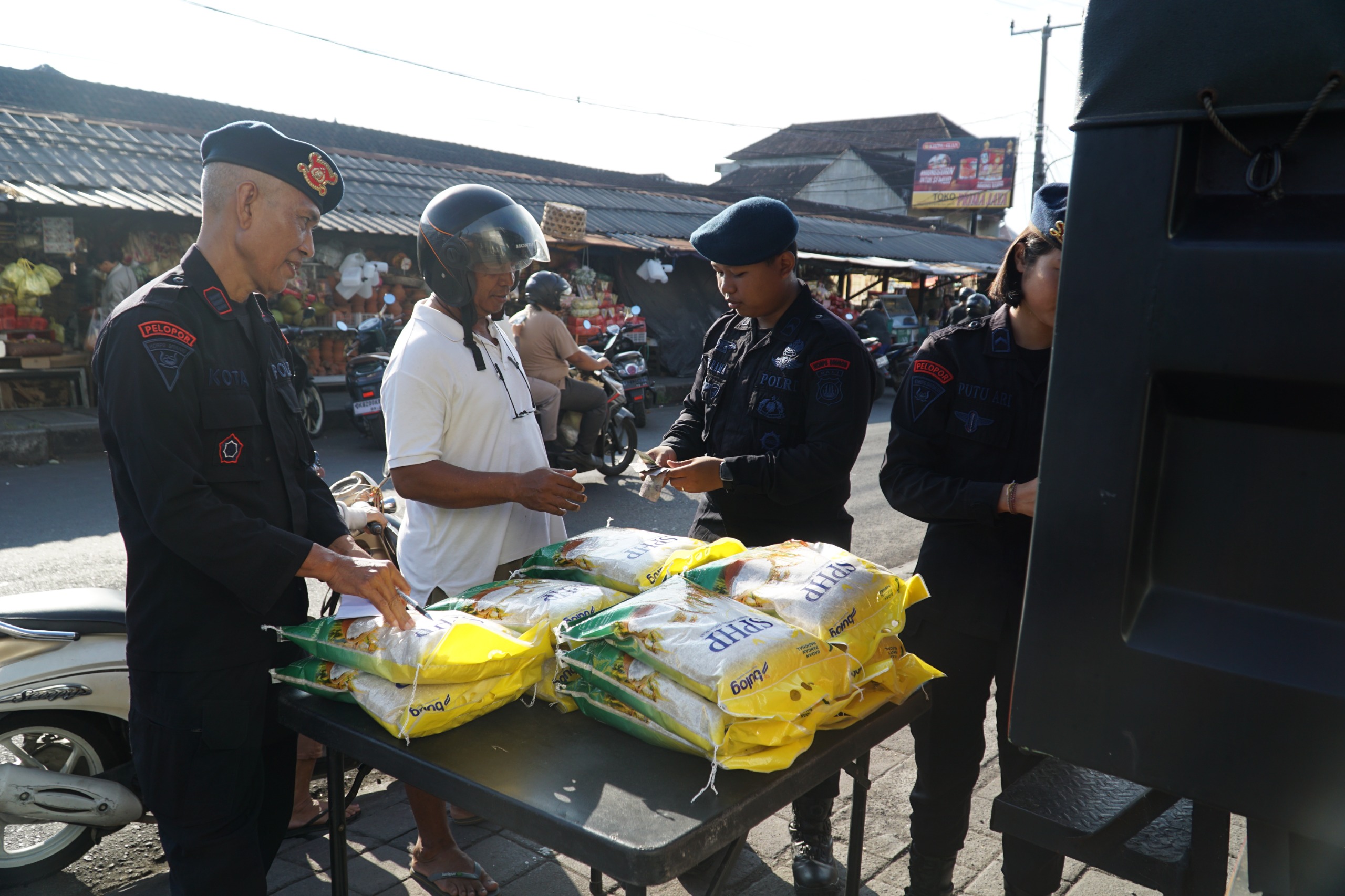 Personel Satbrimob Polda Bali melaksanakan kegiatan Gerakan Pangan Murah (GPM) yang diselenggarakan di Pasar Terminal Batubulan sebagai bentuk dukungan terhadap program pemerintah dalam menjaga stabilitas pasokan dan harga pangan, khususnya komoditas beras Bulog (13/10/2025).