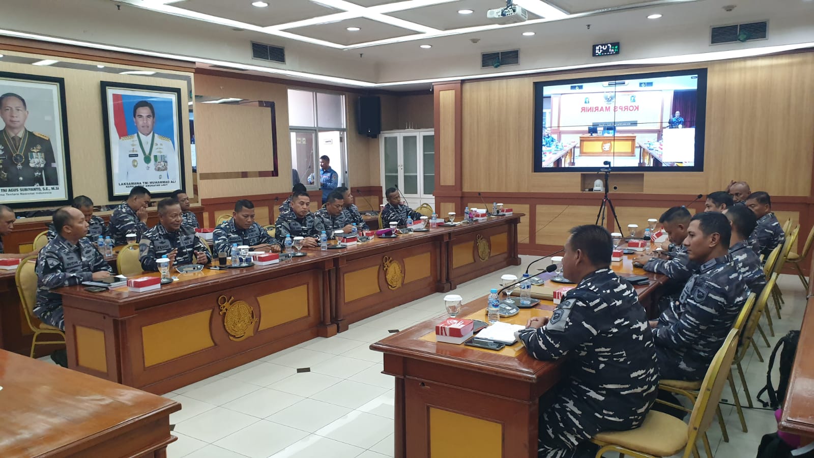 Korps Marinir (Pangkormar) Letnan Jenderal TNI (Mar) Dr. Endi Supardi, SE, MM, M.Tr.Opsla., CHRMP., CRMP., beserta pejabat Mako Kormar melaksanakan giat temu pagi membahas tentang persiapan kunjungan Panglima TNI Jenderal TNI Agus Subiyanto dan Chief of Australian Defense Force (ADF) Admiral David Johnston, serta persiapan Sarasehan dalam rangka HUT Ke-80 Korps Marinir yang bertempat di taman wanarata Mako Kormar, Jln. Raya Usman dan Harun No. 40 Kwitang Jakarta Pusat, Senin (13/10/2025).