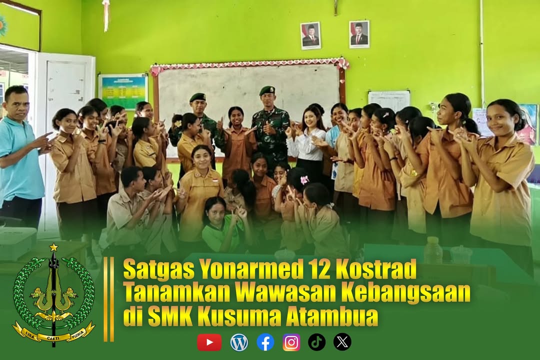 Belu – Dalam rangka menumbuhkan semangat cinta tanah air dan memperkuat karakter generasi muda di wilayah perbatasan, Satgas Pamtas RI–RDTL Sektor Timur Yonarmed 12 Kostrad Pos Cakra melaksanakan kegiatan pengajaran dan pendidikan di SMK Kusuma Atambua. Kegiatan ini mengangkat materi Wawasan Kebangsaan sebagai upaya membentuk jiwa nasionalisme di kalangan pelajar. Sabtu (11/10/2025).