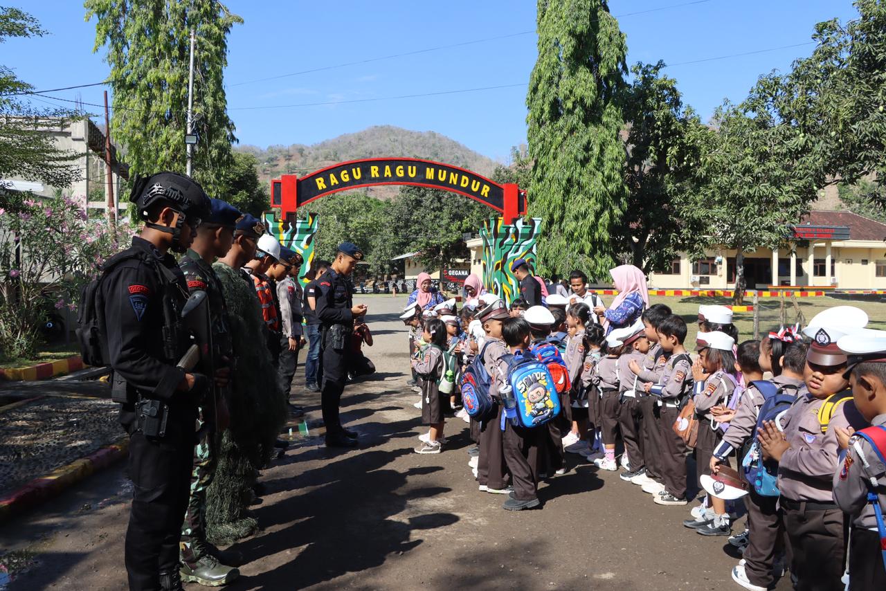 Kegiatan ini disambut hangat oleh para personel Brimob yang dengan penuh semangat memperkenalkan berbagai perlengkapan operasional kepada anak-anak.