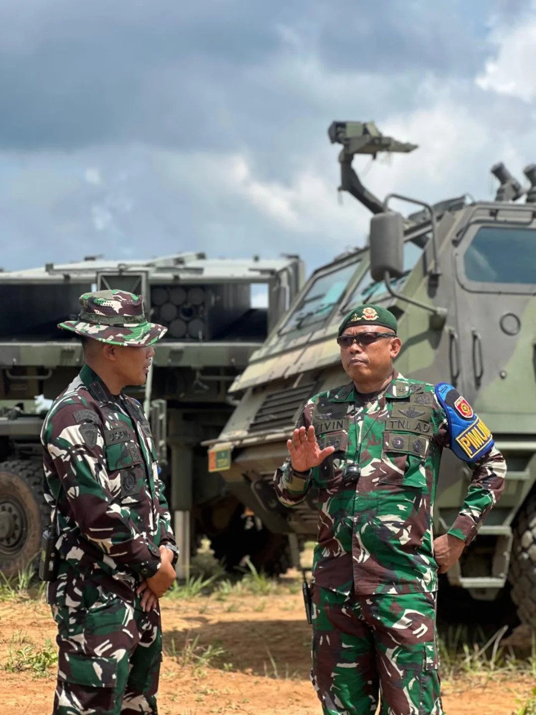 Baturaja – Kepala Staf Divisi Infanteri 1 Kostrad Brigjen TNI Vivin Alivianto meninjau langsung pelaksanaan Latihan Menembak Senjata Berat Terpadu (Latbakjatrat) Artileri Medan yang digelar di Pusat Latihan Tempur (Puslatpur) Baturaja, Selasa (14/10/2025).
