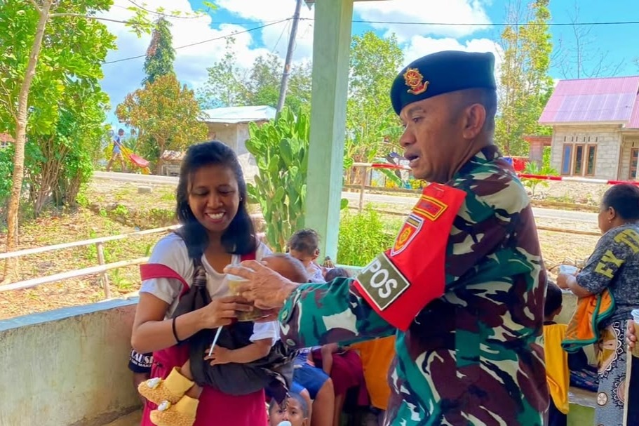 Belu – Pos Maubusa Satgas Pamtas RI-RDTL Sektor Timur Yonarmed 12 Kostrad melaksanakan kegiatan pelayanan kesehatan bagi anak balita di Posyandu Dusun Nuaderok, Desa Asumanu, Kecamatan Raihat, Kabupaten Belu, Nusa Tenggara Timur. Selain pemeriksaan kesehatan, kegiatan juga dirangkaikan dengan pembagian bubur kacang ijo sebagai upaya meningkatkan asupan gizi bagi anak-anak di wilayah perbatasan. Selasa (14/10/2025).