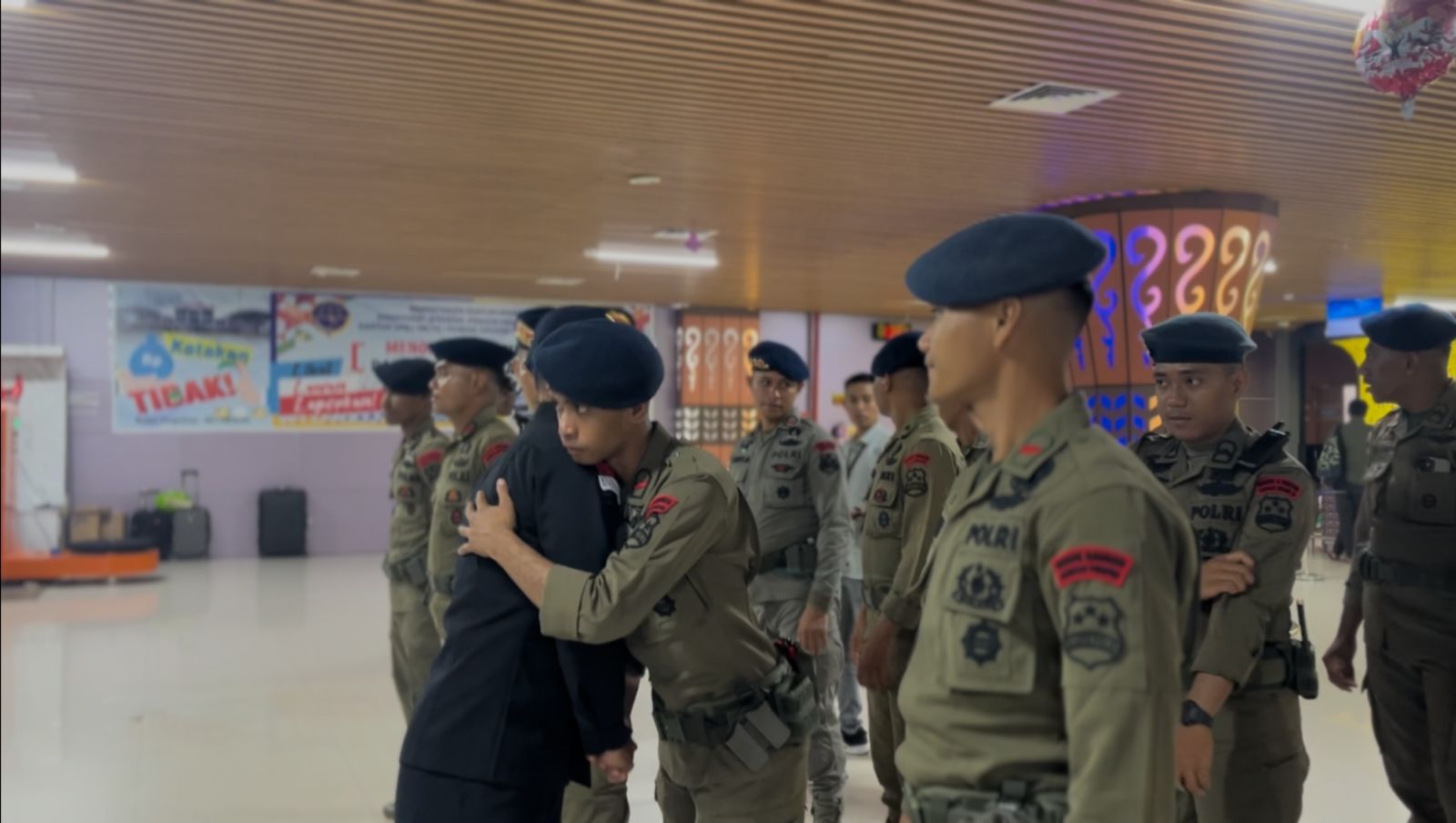Dan melaksanakan apel terkahir di dalam bandara sebelum menuju ruang tunggu Dpp Komandan kompi 1 batalion A Resimen II pelopor pasukan Brimob III korp Brimob Polri