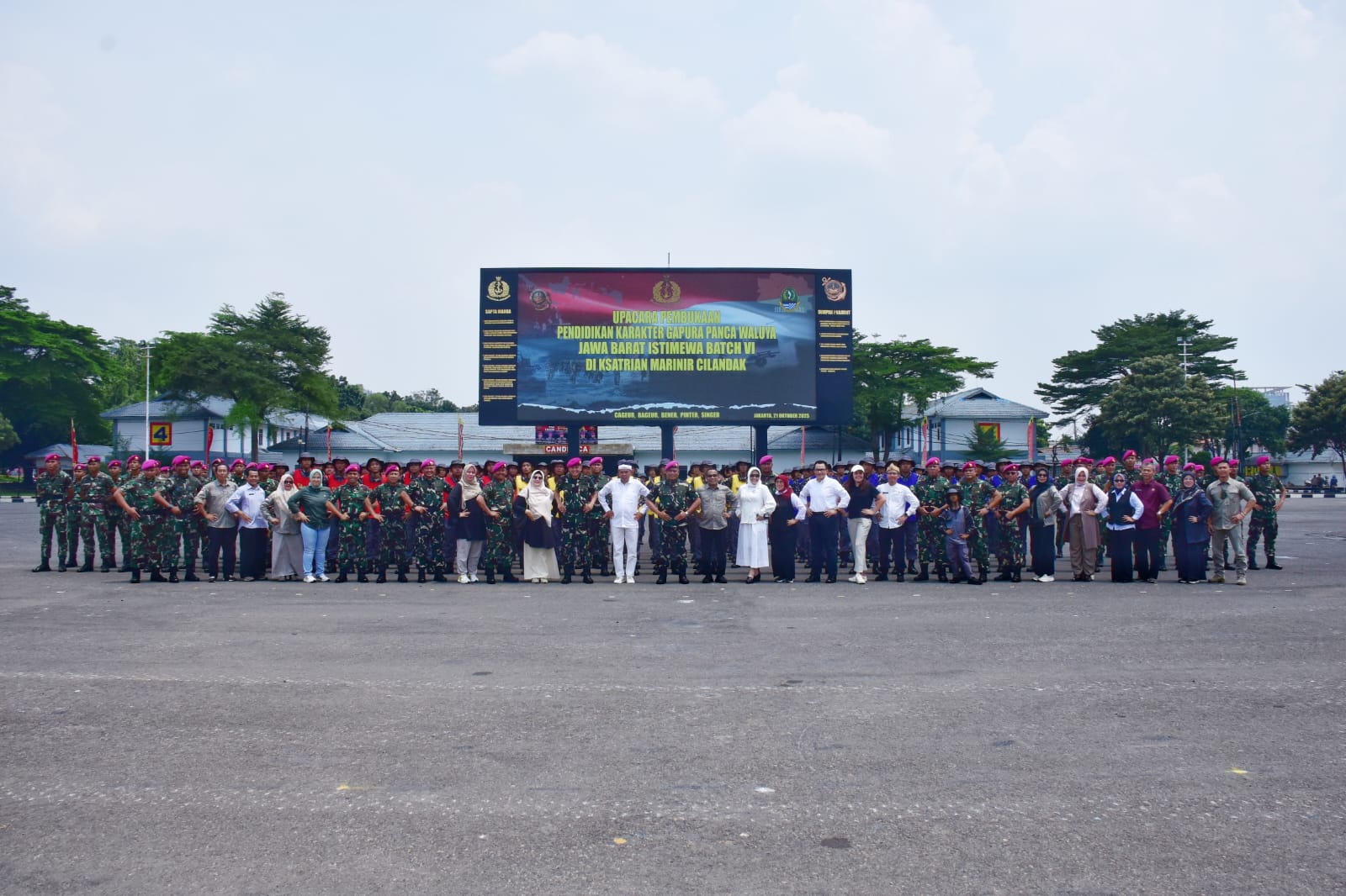 Panglima Korps Marinir (Pangkormar) Letnan Jenderal TNI (Mar) Dr. Endi Supardi, S.E., M.M., M.Tr.Opsla., CHRMP., diwakili Kepala Staf Korps Marinir (Kaskormar) Mayor Jenderal TNI (Mar) Muhammad Nadir, M.Tr.Opsla mendampingi Gubernur Propinsi Jawa Barat, Kang Dedi Mulyadi, dalam upacara pembukaan Pelatihan Pendidikan Karakter Gapura Waluya Jawa Barat Istimewa Tahun 2025 yang ditujukan bagi para pelajar tingkat menengah atas. Kegiatan tersebut berlangsung di Lapangan Apel Brigif 1 Marinir Cilandak, Jakarta Selatan, Selasa (21/10/2025).