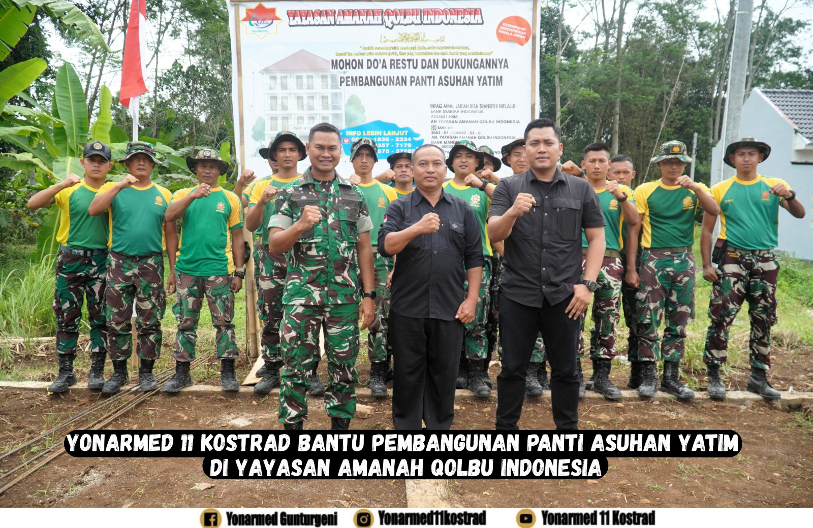 Magelang – Yonarmed 11 Kostrad melaksanakan kegiatan karya bakti membantu pembangunan Panti Asuhan Yatim milik Yayasan Amanah Qolbu Indonesia di Dusun Klontong, Desa Jambewangi, Kecamatan Secang, Kabupaten Magelang. Sebanyak 20 prajurit terlibat langsung bersama pengurus yayasan membangun tiang penyangga gedung panti asuhan yang direncanakan berdiri empat lantai. Kamis (23/10/2025).