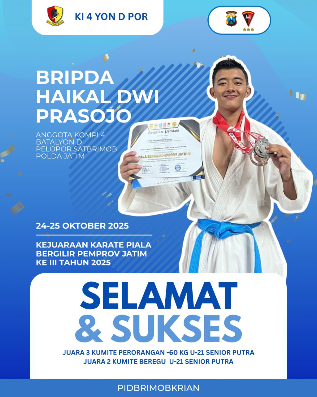 Kebanggaan bagi Kompi 4 Batalyon D Pelopor atas keberhasilan dan kesuksesan anggota dalam Kejuaraan Karate Piala Bergilir Pemprov Jatim Ke III Tahun 2025. Kejuaraan ini berlangsung pada tanggal 24-25 Oktober 2025.