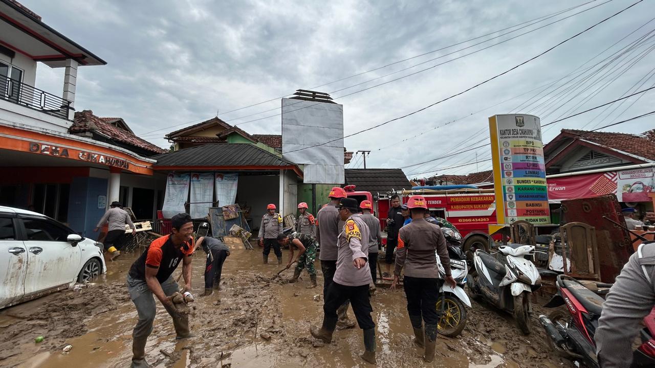 Tim SAR Batalyon B Pelopor Satbrimob Polda Jabar yang dipimpin oleh Dantim SAR Aiptu Awaluddin bergerak cepat melakukan kegiatan bantuan dan pembersihan pascabencana banjir bandang yang melanda wilayah Kecamatan Cisolok, Kabupaten Sukabumi