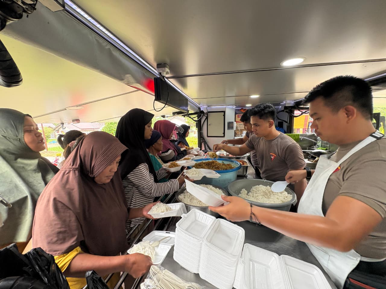 Personel Brimob Lampung tampak bahu-membahu menyiapkan dan mendistribusikan makanan siap saji kepada warga sekitar, termasuk kelompok rentan yang masih berjuang memulihkan kondisi pascabencana.