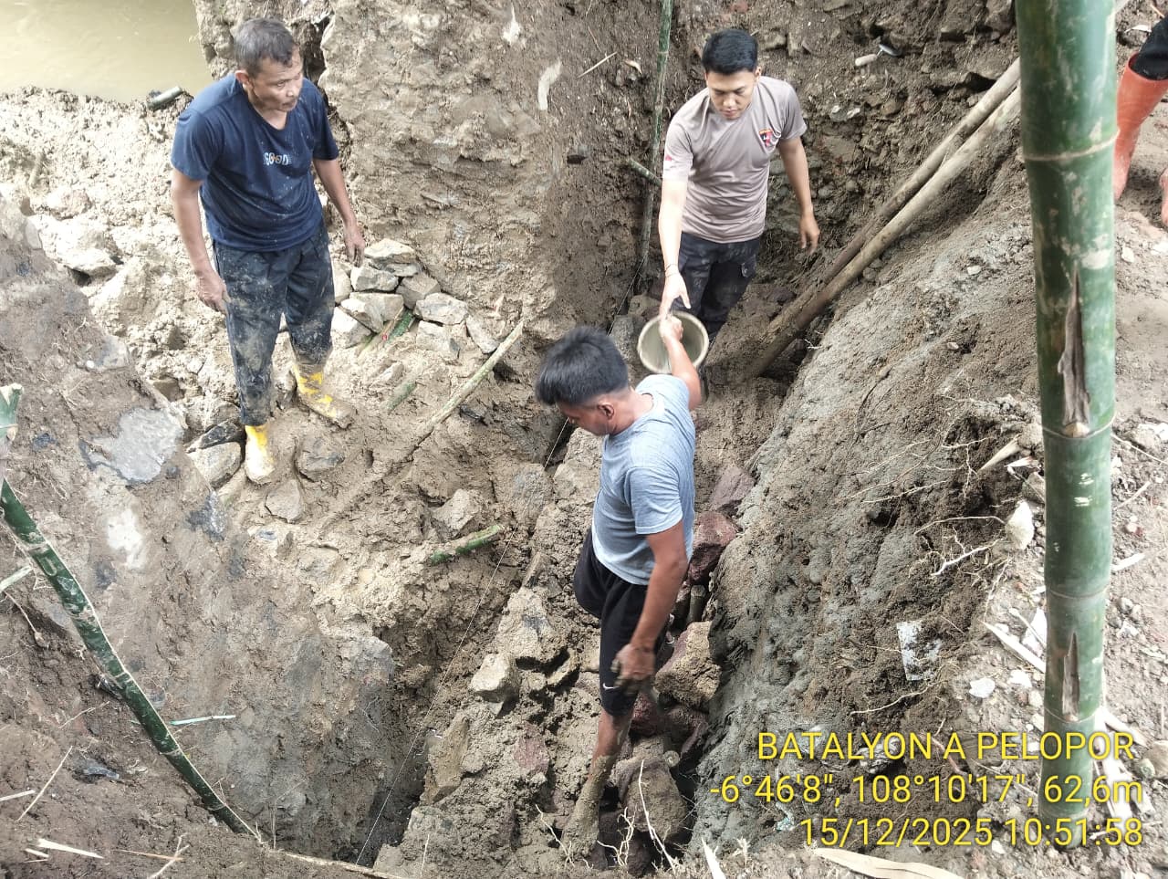Pada kegiatan hari ini, personel Tim SAR Batalyon A Pelopor bersama masyarakat setempat bahu – membahu melaksanakan pembuatan pondasi jembatan yang akan dibangun kembali. Proses pengerjaan dilakukan secara manual dengan penuh kehati-hatian, mengingat pondasi merupakan bagian vital yang menentukan kekuatan dan keamanan jembatan ke depannya.