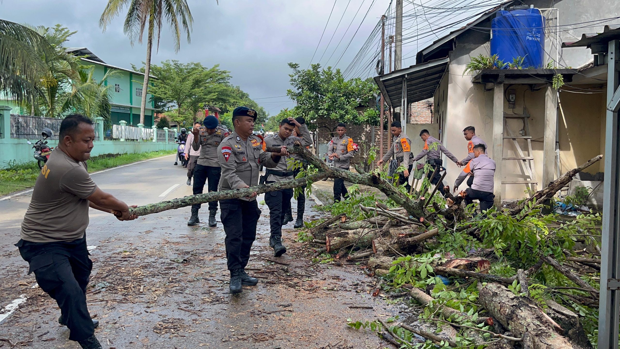 Di lokasi kejadian tampak personel Brimob menggunakan helm pengamanan dan perlengkapan kerja. Para personel terlihat bekerja secara hati-hati saat memotong batang pohon besar yang tumbang di pinggir jalan.